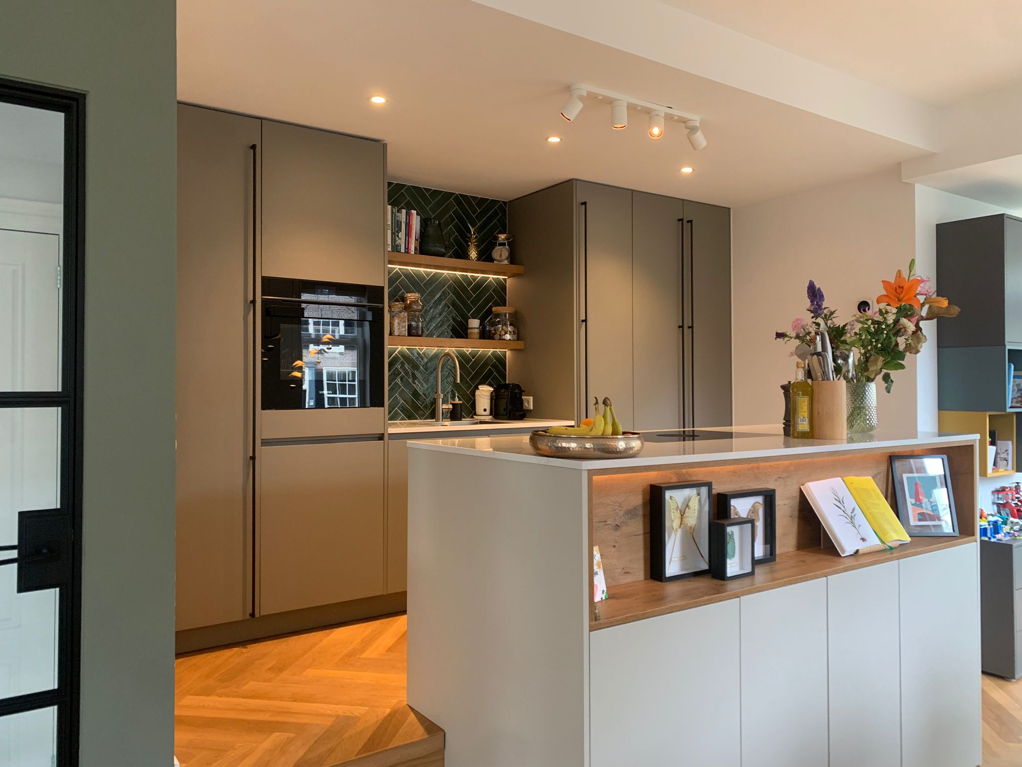 Het keukeneiland sluit aan op de twee verschillende vloerniveaus van de woonkamer