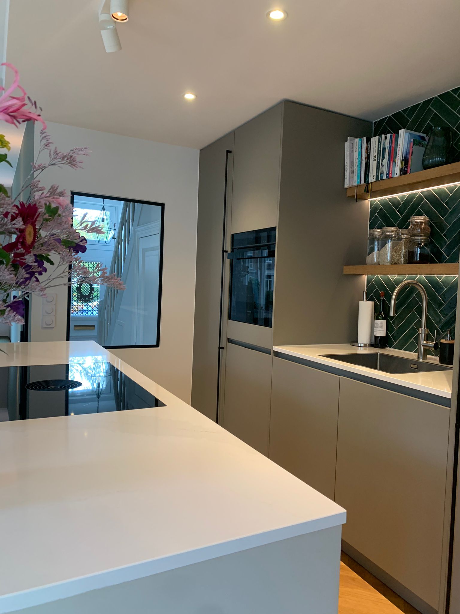 Om te zorgen voor meer licht, en daarme gevoel van ruimte, is een venster vanuit de keuken naar de hal gemaakt