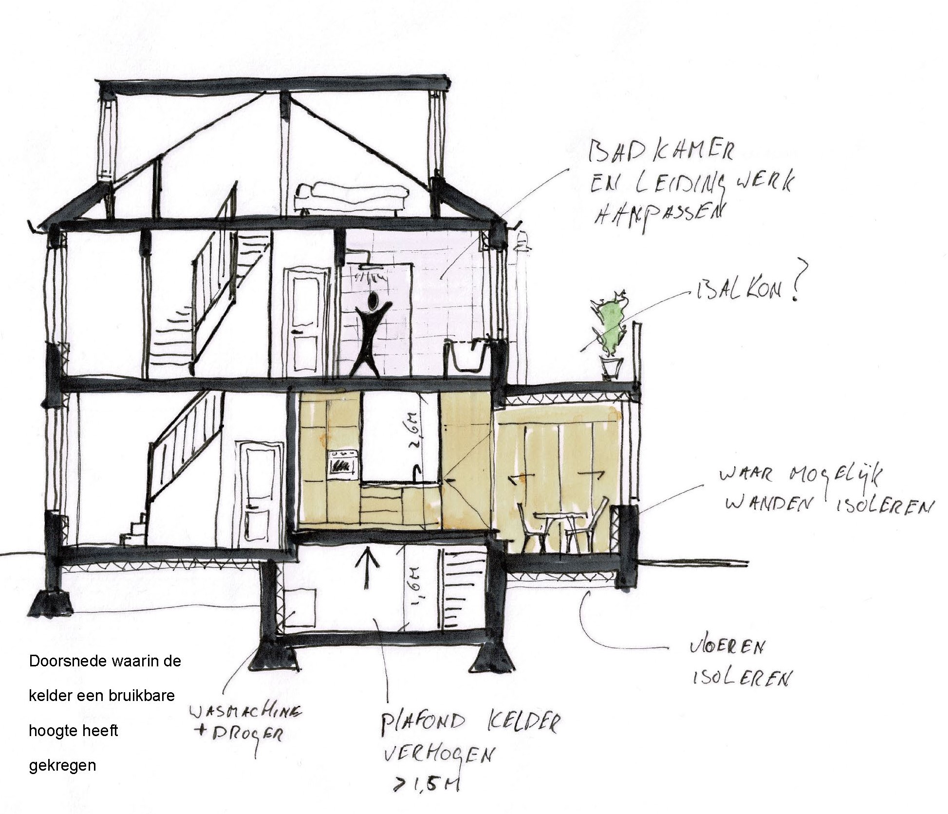Eerste schets van het ophogen van de vloer bij de keuken, om zo een kelder te creëren waar je rechtop kunt staan