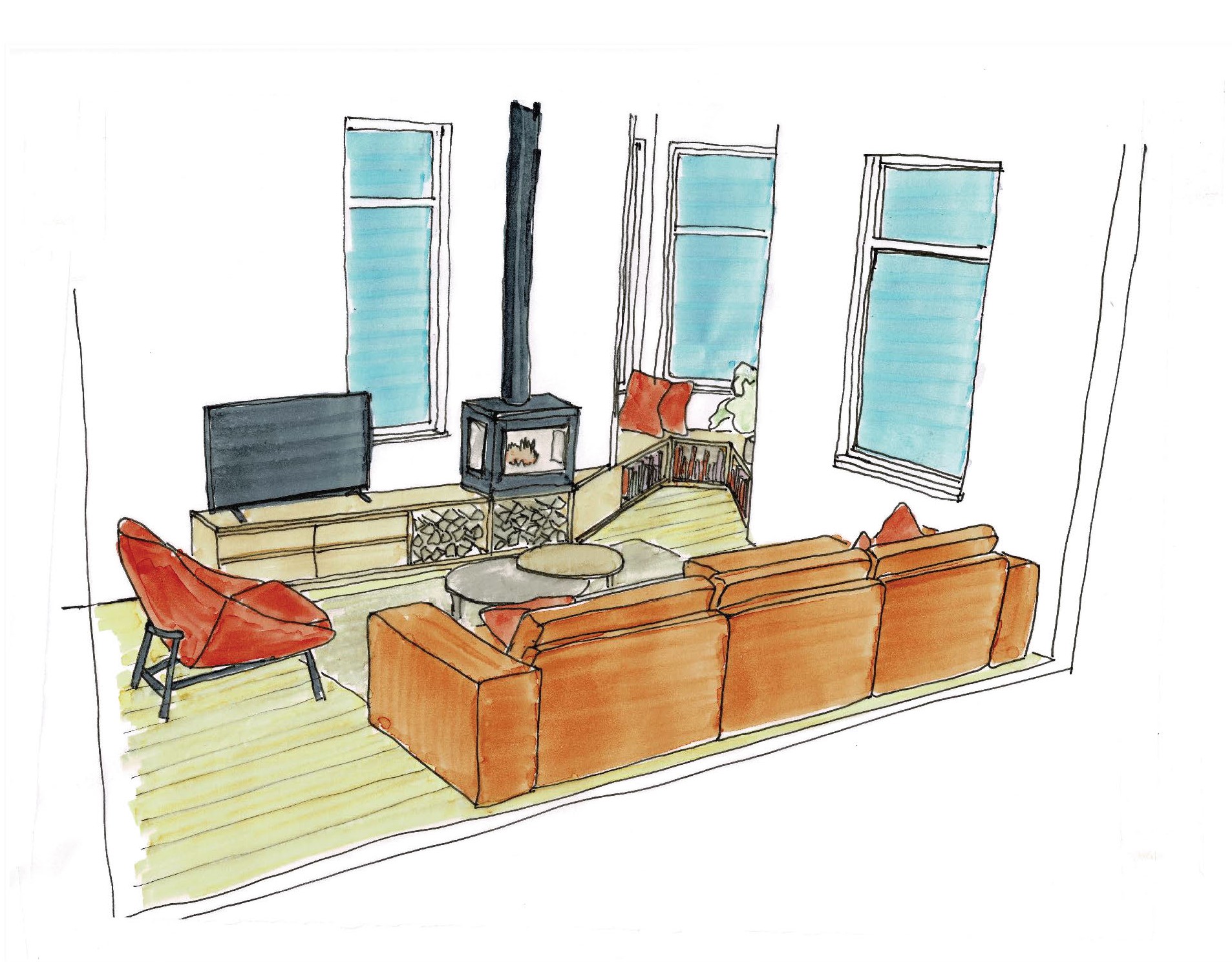 Schetsontwerp van het meubel als zitmeubel in de erker