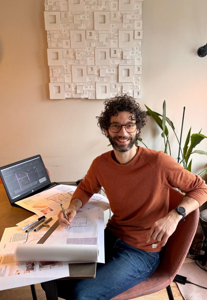 Na mijn afstuderen aan de TU Delft heb ik voor verschillende architectenbureaus gewerkt, voor verschillende ontwerpopgaven: van grootschalige sociale woningbouw tot op maat gemaakte villa’s. In 2018 besloot ik volledig voor mezelf te beginnen, omdat ik gefrustreerd begon te raken: ik zat namelijk altijd aan tafel met projectontwikkelaars, woningbouwverenigingen en mensen van de gemeente, maar nooit met diegenen die daadwerkelijk gingen wonen in wat ik ontwierp. Zo kon ik de leukste plannen, gezellige binnentuinen en plattegronden bedenken om vervolgens deze vanuit kostenoverwegingen weer langzaam uit de plannen te zien verdwijnen. Toen ik 2018 de vraag kreeg een verbouwing voor een kennis van mij te ontwerpen voelde ik: dit is het! Het directe contact met een opdrachtgever die er ook daadwerkelijk woonde en de ontwerpopgave die uitging van ‘hoe maak ik de woning passend voor jullie leven ’ in plaats van een universeel ontwerp, maakte dat ik op deze manier veel meer kon betekenen en dat ik daar ook veel meer motivatie uithaalde.